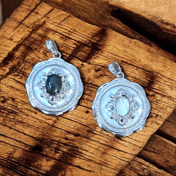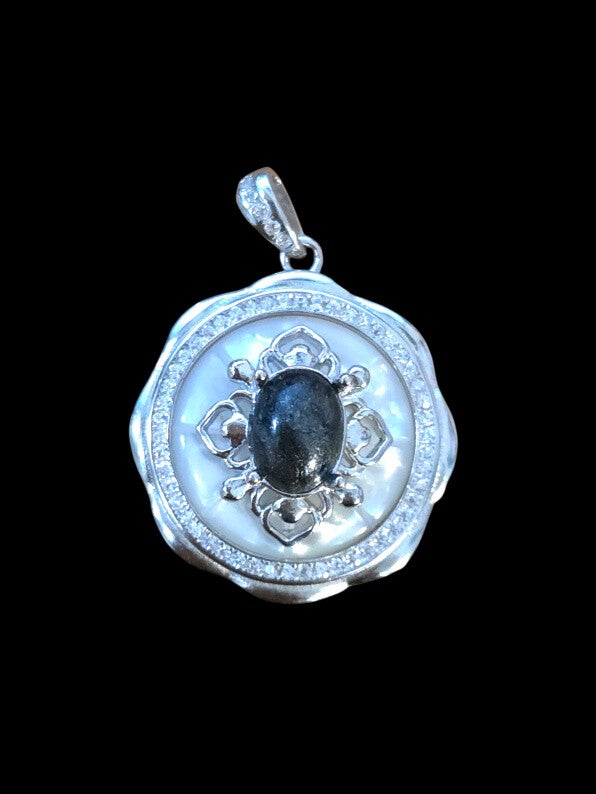 Dit is een bijzondere hanger. Een parelmoer achtergrond, omgeven met kleine glimmende steentjes. In het midden kan een gepersonaliseerd steentje gemaakt worden. Welke kleur wilt u dat het word?